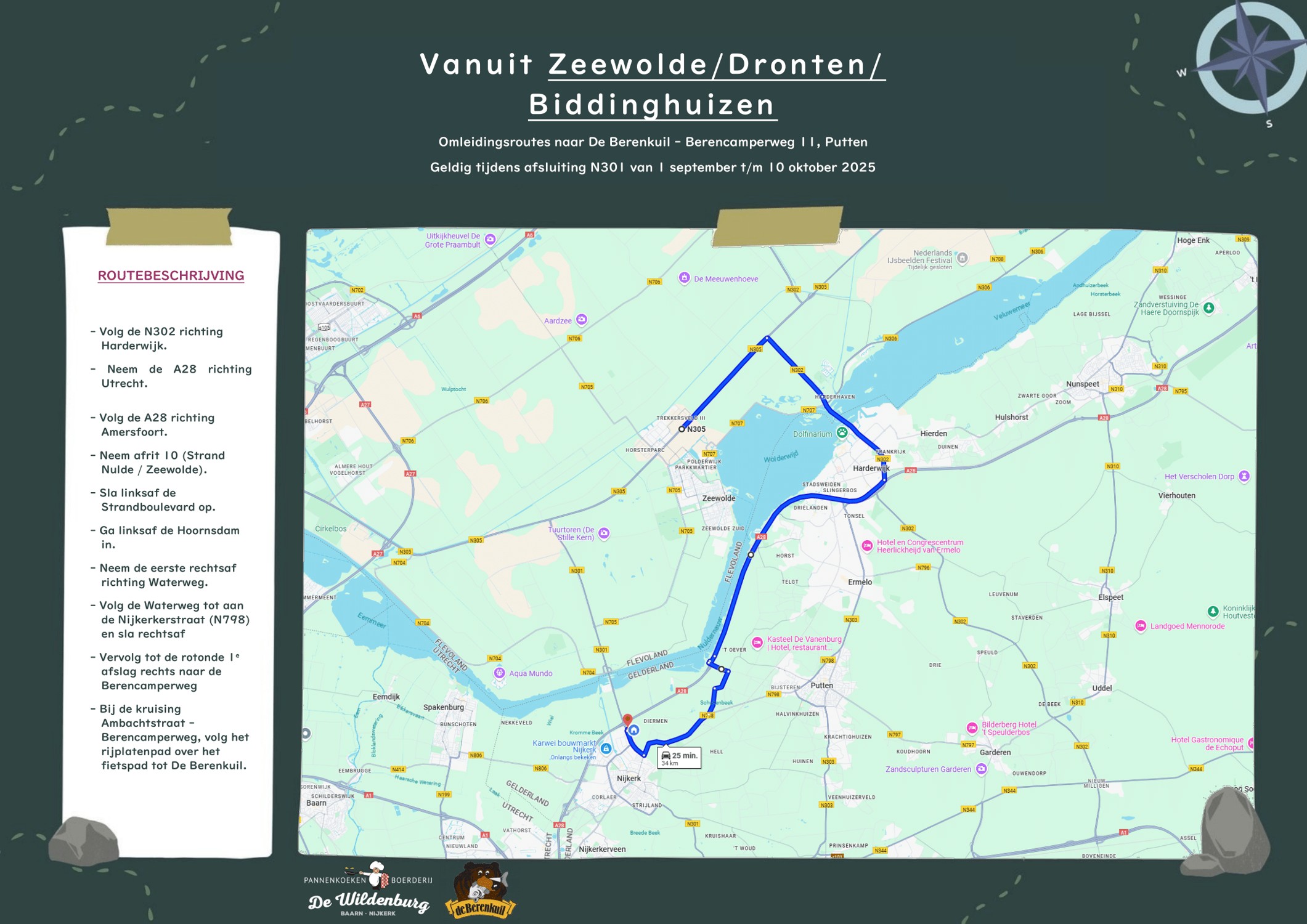 - Verkeer wordt geleid via Harderwijk (N302) of Huizen (A27). Volg de duidelijke borden langs de weg.