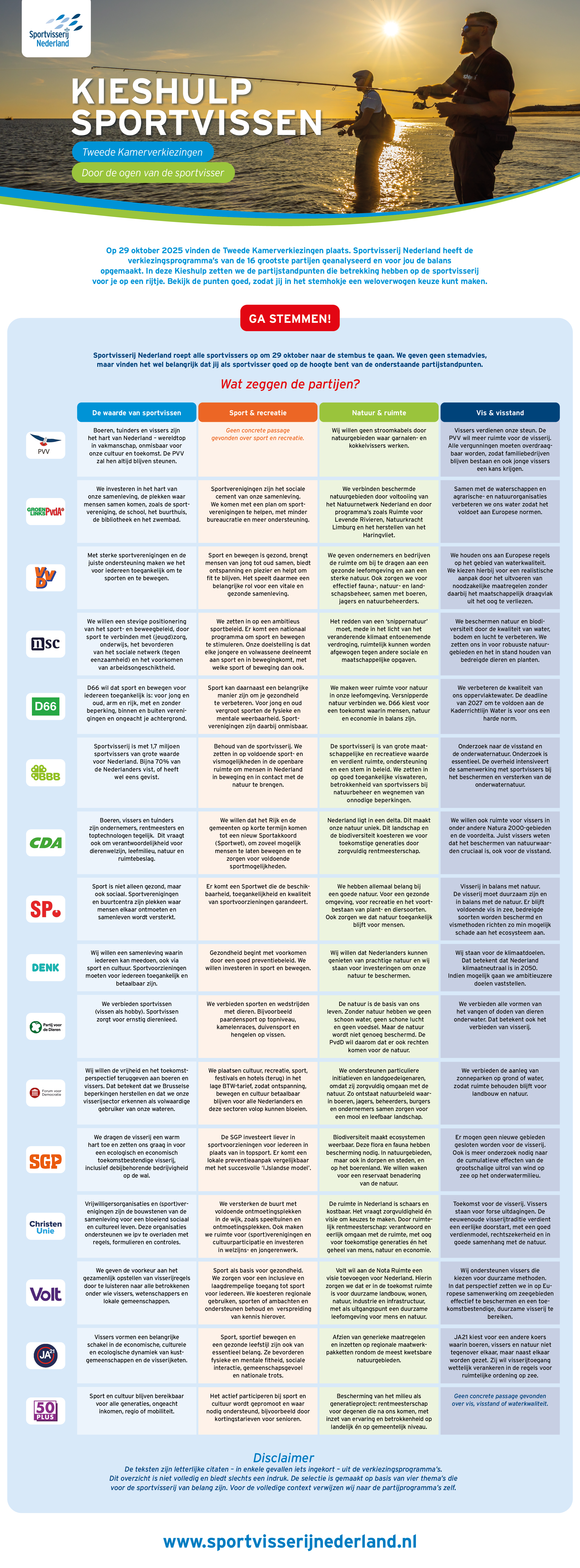 Op 29 oktober 2025 vinden de Tweede Kamerverkiezingen plaats. Sportvisserij Nederland heeft de verkiezingsprogramma’s van de 16 grootste politieke partijen geanalyseerd en voor jou de balans opgemaakt. In de speciale Kieshulp Sportvissen in dit bericht, zetten we de partijstandpunten die betrekking hebben op de sportvisserij voor je op een rijtje. Bekijk de punten goed, zodat jij in het stemhokje een weloverwogen keuze kunt maken.