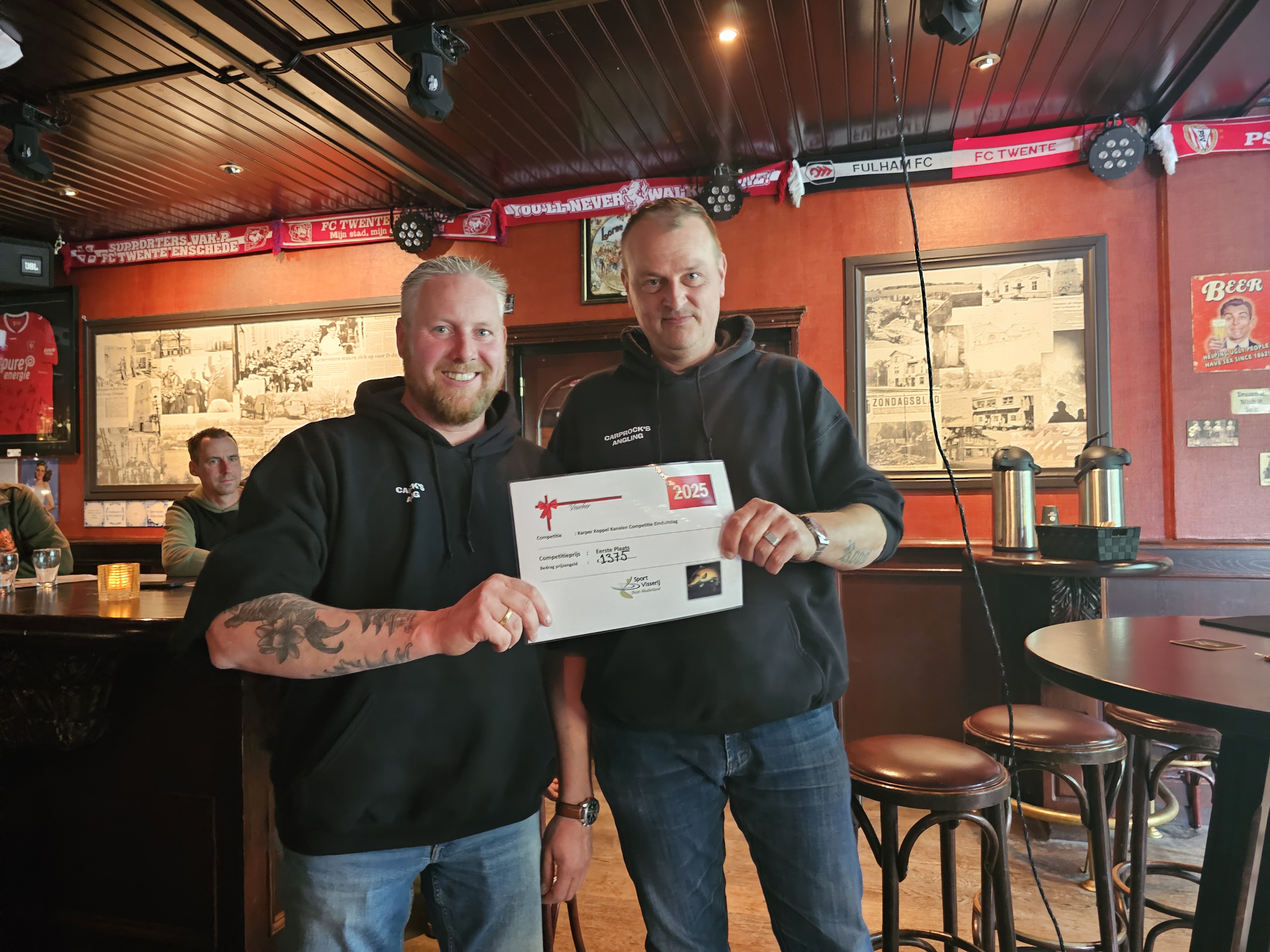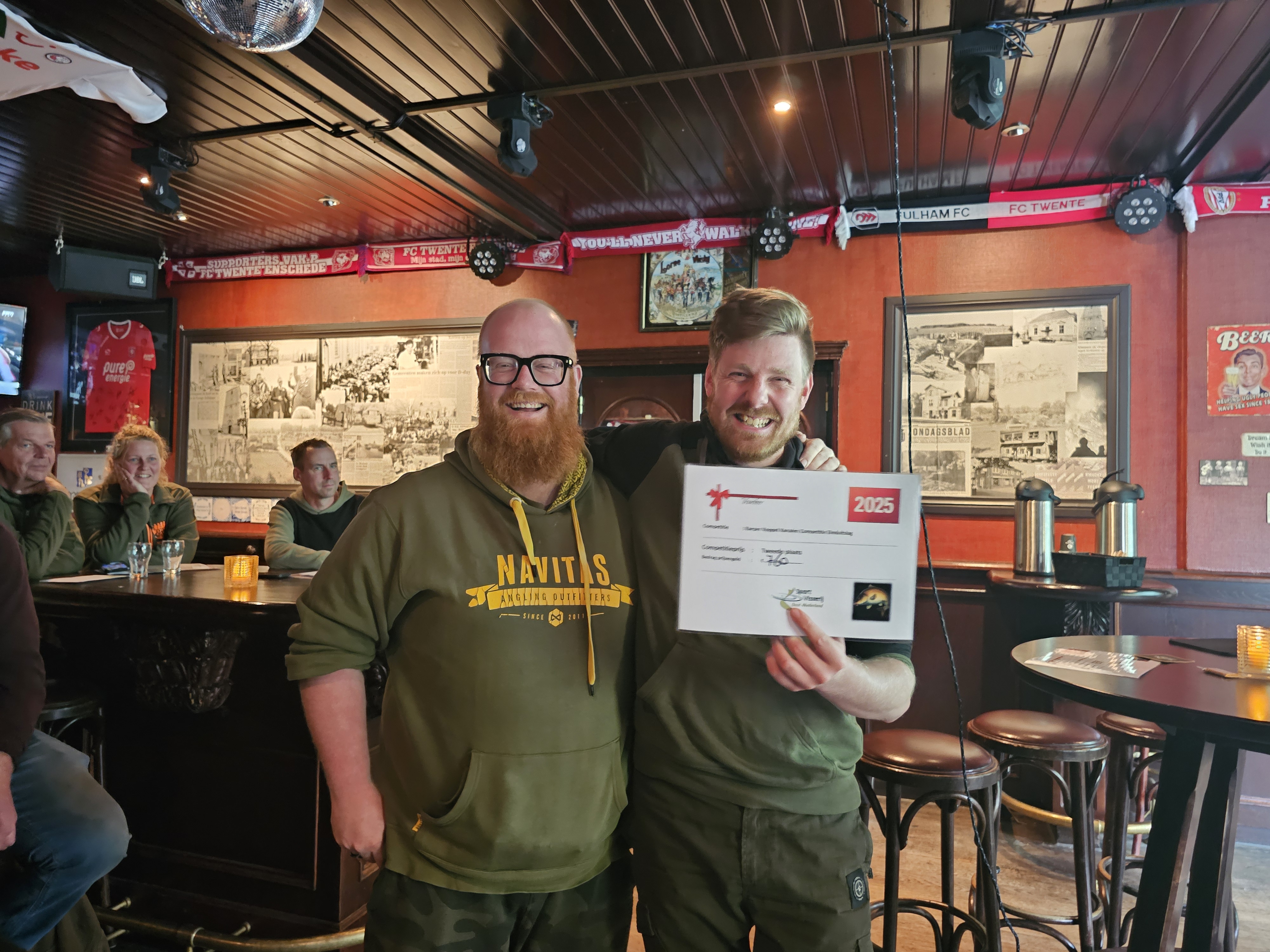 Zoals we het verslag net begonnen eindigde deze competitie aan de Schipbeek onder beroerde weersomstandigheden. Zaterdagochtend meldde een team zich met een karper, een oude spiegel van maar liefst 18,1kg! En daarmee ook meteen de zwaarste vis die gedurende deze hele competitie was gevangen. Omdat alle teams dicht bij elkaar zaten qua punten bleef het tot de laatste minuut vissen op het scherpst van de snede. Helaas bleven andere vangsten uit en was dit de enige gevangen vis. De deelnemers verzamelden zich rond 13:00 bij De Kroon in Markelo voor de prijsuitreiking die rond 14:30, na het opmaken van de prijzen, plaats vond. Rinus Klein van de wedstrijdcommissie nam het woord en verzorgde de prijsuitreiking.