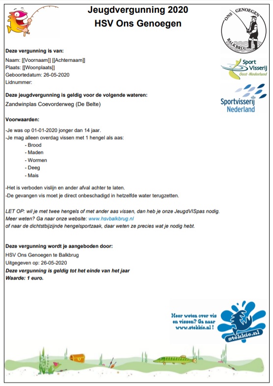 De gratis online jeugdvergunning is geldig voor bepaalde wateren van je lokale hengelsportvereniging en in alle federatieve wateren. Op de vergunning staat vermeld om welke verenigingswateren het gaat en via www.visplanner.nl betreft het wateren waarbij Sportvisserij Oost-Nederland als visrechthebbende vermeld staat.